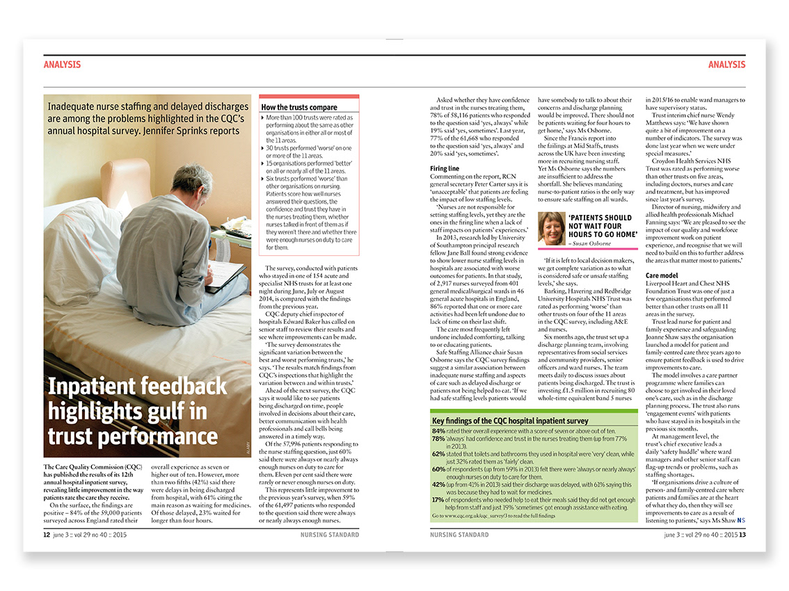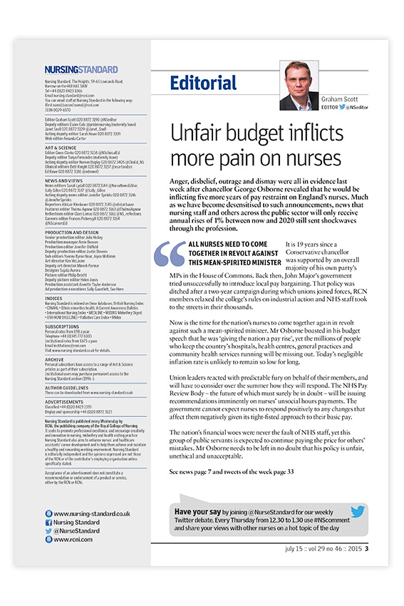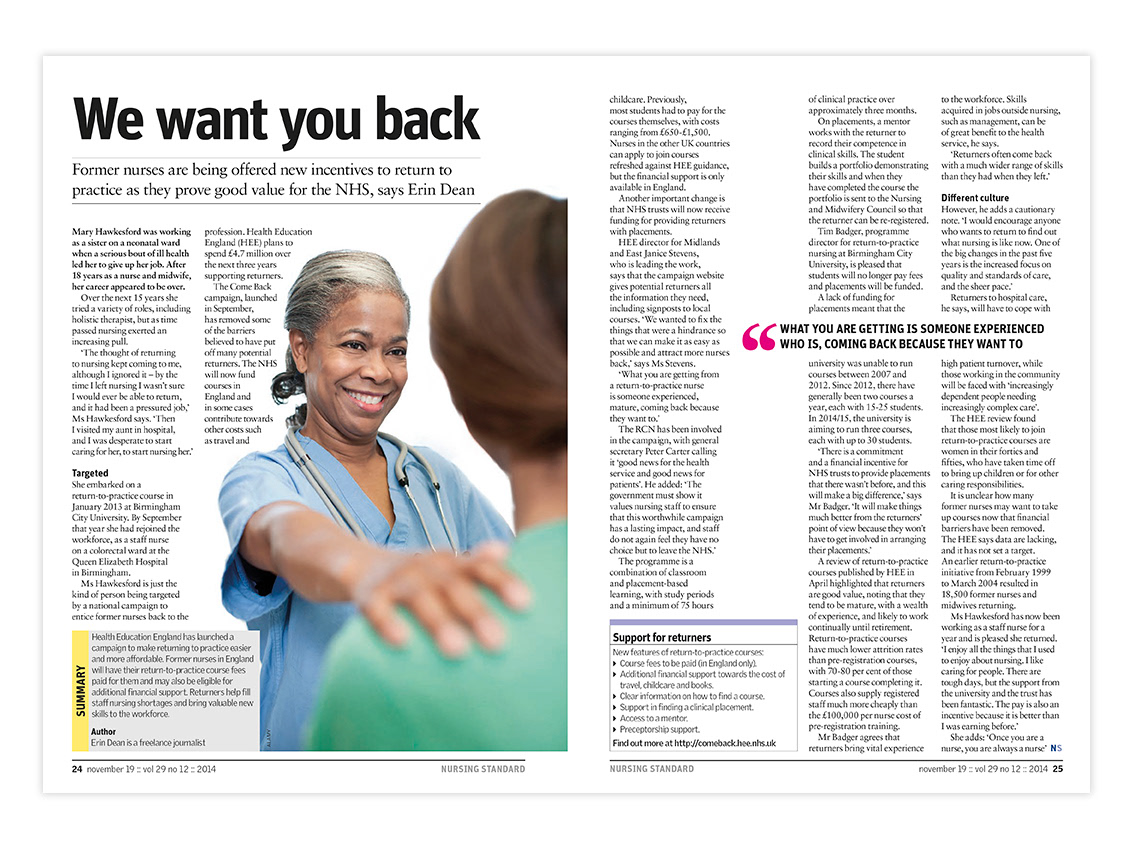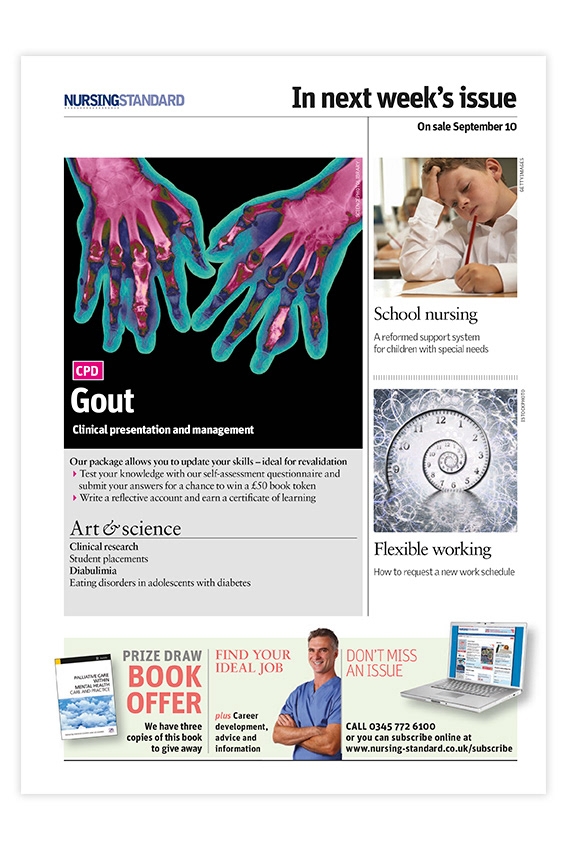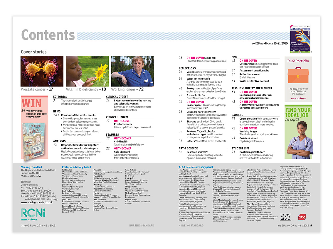 Editorial layout for Nursing Standard magazine published by RCNi. Nursing Standard is the UK's best selling nursing journal and a resource for students and fully qualified nurses.